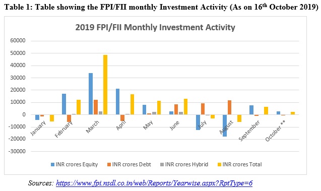 Foreign portfolio Investment Equity market in 2019 has decreased which depicts the slowdown in investment activity due to slowdown in the Economy. In the year 208-19, the FPI investment was deep declined and it is recovering slowly in the year 2019-20 (till 16th October 2019).